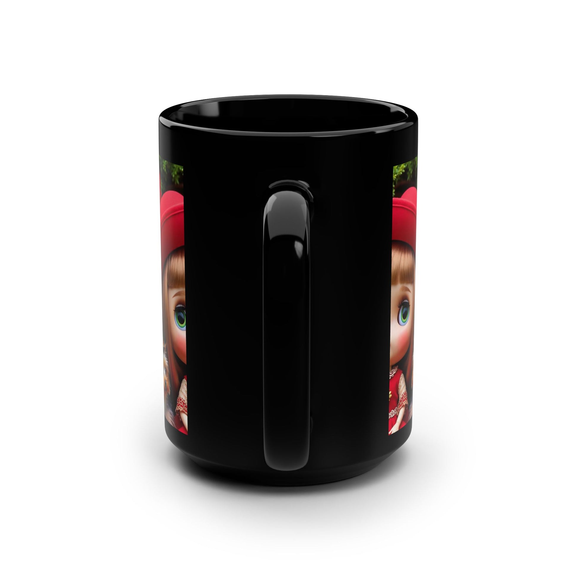 Sip from a glossy black mug that feels like a secret garden come to life. A wide-eyed vintage doll in a red hat sits among velvet roses, flanked by two tiny Yorkshire companions — the artwork wraps the mug like a miniature portrait. Mornings slow down with this little scene: warm coffee, a soft exhale, and the quiet company of something whimsical and familiar. The deep black ceramic makes colors pop and keeps the mood cozy and slightly mysterious. It slides easily into everyday routines and into moments when someone wants to linger over a story or share a smile.
